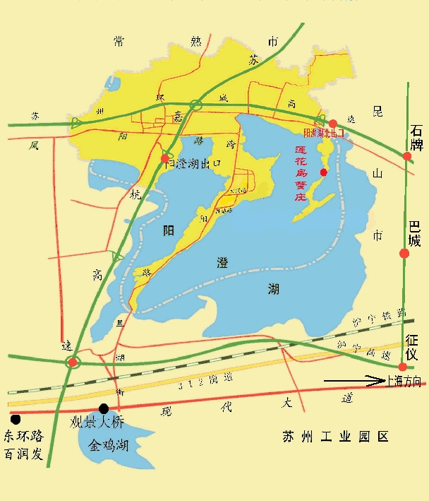 南京方向:滬寧高速一直開到東橋樞紐,轉(zhuǎn)蘇州繞城高速往太倉(cāng)方向,到陽(yáng)澄湖北下,向右再開20秒鐘蓮花島村碼頭即到。