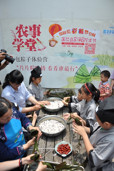 小朋友整裝待發(fā) 相城區(qū)陽(yáng)澄湖生態(tài)休閑旅游度假區(qū)在蓮花島推出農(nóng)事學(xué)堂活動(dòng),以農(nóng)村、田地作為課堂,讓游客參與農(nóng)耕體驗(yàn),包括上農(nóng)事課堂、開展親子活動(dòng)、下田插秧、包粽子、陽(yáng)澄祈福等。活動(dòng)當(dāng)日,大批家長(zhǎng)趁端午小長(zhǎng)假帶著孩子去上農(nóng)事課堂,與孩子一起體驗(yàn)插秧、包粽子。