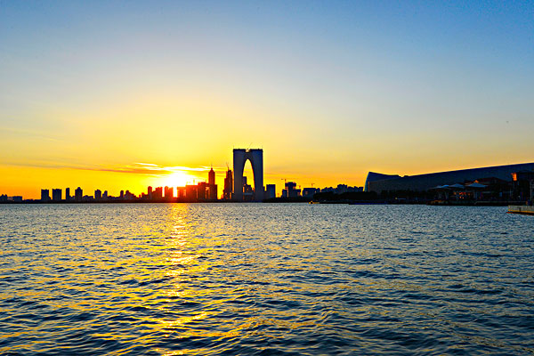 其實陽澄湖又何止大閘蟹。陽澄湖跨蘇州市區(qū)、工業(yè)園區(qū)、相城區(qū)、昆山及常熟,面積約117平方千米,是江蘇重要的淡水湖泊之一。 陽澄湖擁有岸線9千余米,岸線蜿蜒曲折,富有詩意。其中“美人腿”半島是陽澄湖的一個特色。這里花海璀璨,是拍攝婚紗照的絕佳選景地,也是騎行愛好者的必去打卡地。 陽澄湖蓮花島更是吃大閘蟹的地方,最適合一家人悠閑游,散散步。或者約上親朋好友,就著美景吃上幾只地道的大閘蟹。蓮花島尋鮮樂趣無窮,深秋時節(jié)這是最好的時候。 3.蘇州金雞湖 金雞湖坐落于工業(yè)區(qū)中間,面積達7.4平方千米,緊緊圍繞著這片內(nèi)湖沿岸地區(qū),能夠見到最當代、時尚潮流的建筑。